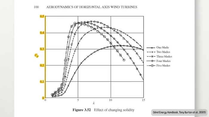 이 그래프는, 다른 매수의 블레이드를 가진 터빈의 효율을 나타낸 것인데, 가로축이 바람에 대한 터빈의 회전 속도를, 세로축이 터빈의 효율성을 나타낸다.